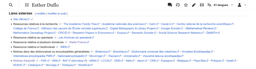 Concrètement, il suffit d’ajouter cinq lettres (le modèle Liens) dans l’article consacré à Esther Duflo, pour que l’article affiche automatiquement une cinquantaine de liens externes susceptibles d’intéresser l’internaute. Voyons comment cela fonctionne à l’aide d’un exemple :