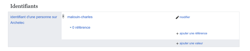 Si ce n’est pas déjà fait, il faut proposer une nouvelle propriété. Quelques semaines plus tard, il est possible d’ajouter des informations dans Wikidata. Cela consiste à ajouter aux éléments Wikidata des députés, la propriété P12865 « identifiant d’une personne sur Archelec » et l’identifiant d’Archelec. Exemple : propriété, débat de proposition.