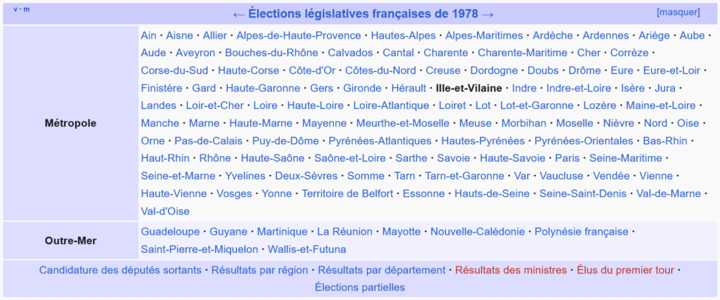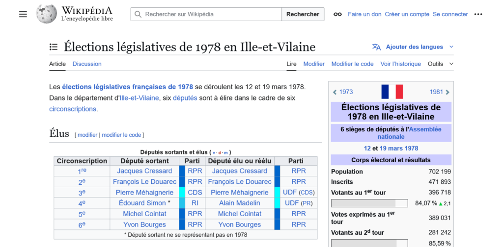 Il y a plusieurs façons d’utiliser Mix’n’Match. Archelec comporte les professions de foi des candidats aux législatives. Or Wikipédia ne consacre d’articles qu’aux candidats élus aux élections législatives, soit 2200 identifiants sur les 33000 dans Archelec. J’ai donc utilisé le mode « Ne rechercher que dans ce catalogue » accessible via le menu Action. Il faut saisir le nom des députés dans le moteur de recherche. Les noms sont récupérés des pages de résultats des élections, par exemple : https://fr.wikipedia.org/wiki/Élections législatives de 1978 en Ille-et-Vilaine.