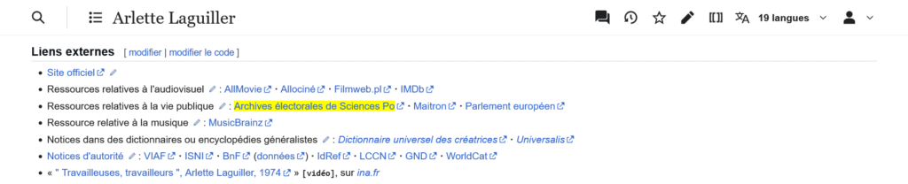 Wikipédia est un site web collaboratif, mais dès que l’on souhaite faire une modification en masse, il faut demander l’autorisation. Il en est ainsi pour afficher de nombreux liens vers un site internet. Le pied de page des articles proposés sur la Wikipédia francophone est particulièrement riche en liens externes. Il est géré par le projet Bases qui permet d’afficher automatiquement des informations stockées dans Wikidata. Le modèle économique de l’encyclopédie ne nécessite pas de conserver l’internaute sur la plateforme, du coup, il n’est pas rare de trouver des articles Wikipédia comportant des dizaines ou des centaines de liens vers d’autres sites web. Cela contribue à la découvrabilité de ressources de qualité. Exemple :