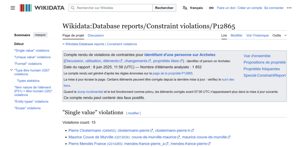 Des comptes rendus de violations de contraintes sont générés. Cela permet de détecter des erreurs d’alignement, par exemple est-ce que tous les éléments sur lesquels figurent un identifiant Archelec sont des êtres humains ?