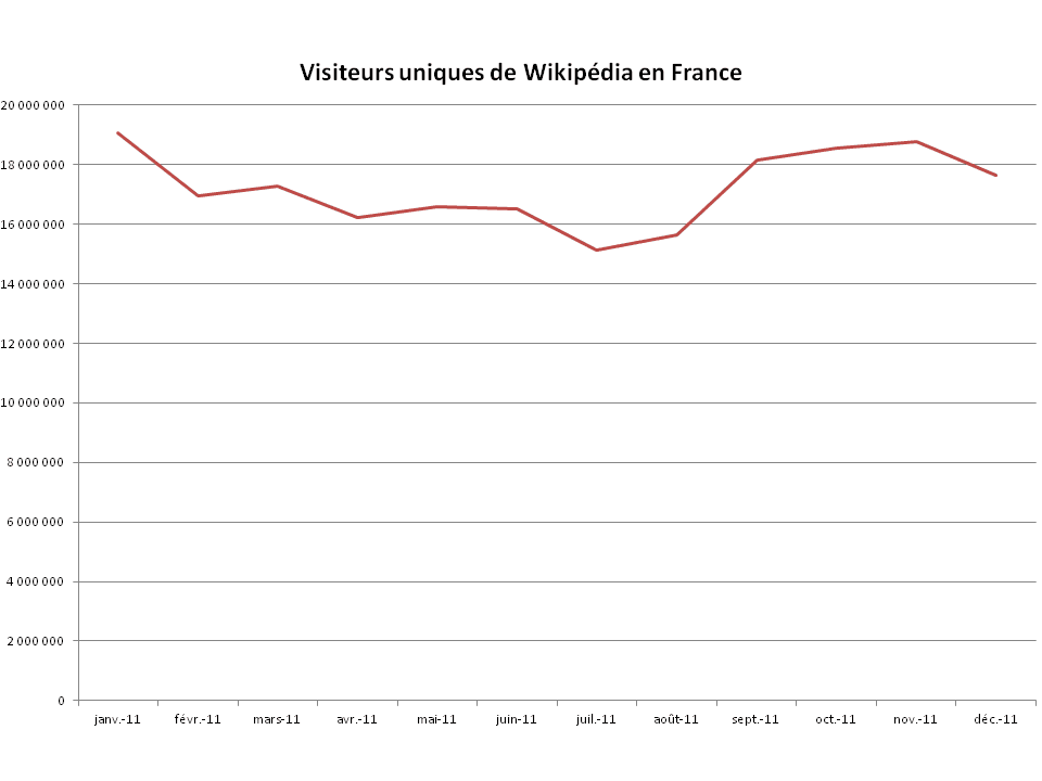 - Tous les ans, l’audience de Wikipédia baisse entre novembre et décembre (- 1 111 000 VU entre novembre et décembre 2011). N’hésitez pas à proposer votre interprétation.