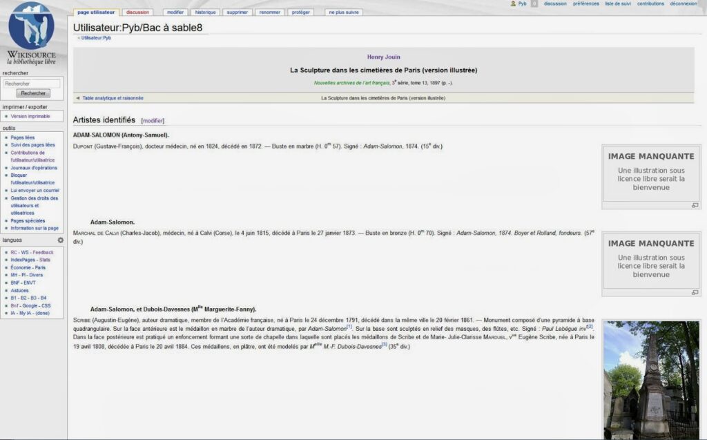 Puis il faut se rendre sur Wikisource pour océriser le texte, corriger les coquilles, le lire, le relire. C’est simple, mais chronophage. Je suis tout de même venu à bout des passages qui m’intéressaient dans l’article d’Henry Jouin, La Sculpture dans les cimetières à Paris, 1897. Jouin a fait un inventaire non exhaustif des œuvres d’art (statues, bustes, médaillons, bas-reliefs, vitraux) présentes au Père-Lachaise à la fin du dix-neuvième siècle.