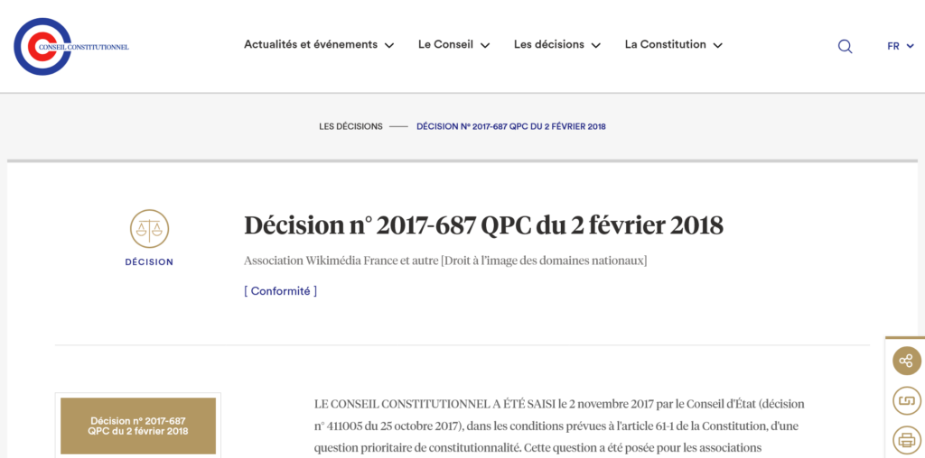 Contexte – Paris, le 6 novembre 2017. En 2016, la loi Création a mis en place un nouveau droit à l’utilisation de l’image des biens des domaines nationaux, comme le château de Chambord, le palais du Louvre ou celui de l’Élysée. Cette disposition permet à leurs gestionnaires de contrôler l’usage commercial de l’image de ces bâtiments emblématiques et de le soumettre à redevance. Considérant que cette mesure constitue une remise en cause des droits légitimes d’utilisation du patrimoine culturel, les associations Wikimédia France et La Quadrature du Net ont attaqué un des décrets d’application de cette loi et soulevé une question prioritaire de constitutionnalité (QPC). Par une décision en date du 20 octobre 2017, le Conseil d’État a accepté de renvoyer l’affaire devant le Conseil constitutionnel, en considérant que la demande était bien fondée sur des moyens nouveaux et sérieux.