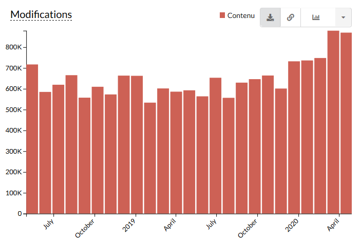 La hausse de la communauté des rédacteurs s’est traduite par une forte hausse du nombre de modifications des articles de l’encyclopédie. Alors que les trois premiers mois de 2020 sont déjà marqué par une hausse de 20-23 % du nombre de modifications par rapport à la moyenne de 2019, le taux de croissance est de 43-44 % pour avril et mai.