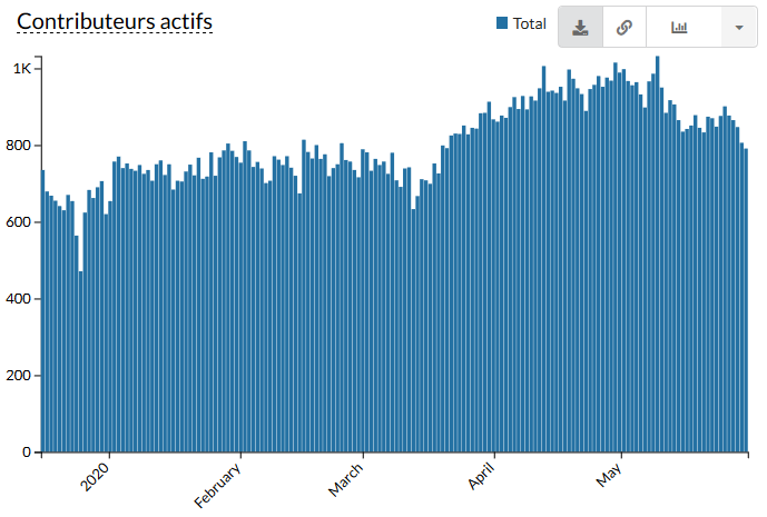J’avais montré dans le précédent billet que le 13 mars s’est traduit par un nombre de lecteurs très bas, ghabituellement observé le 24 décembre. Le lendemain de l’annonce de la fermeture des écoles a également eu un impact côté rédacteurs. C’est le jour le plus bas de l’année 2020 avec 633 contributeurs, légèrement au-dessus du 31 décembre (620). Après ce choc, le nombre de contributeurs a fortement augmenté pour atteindre un niveau historique en dépassant légèrement la barre des 1000 contributeurs actifs par jour.