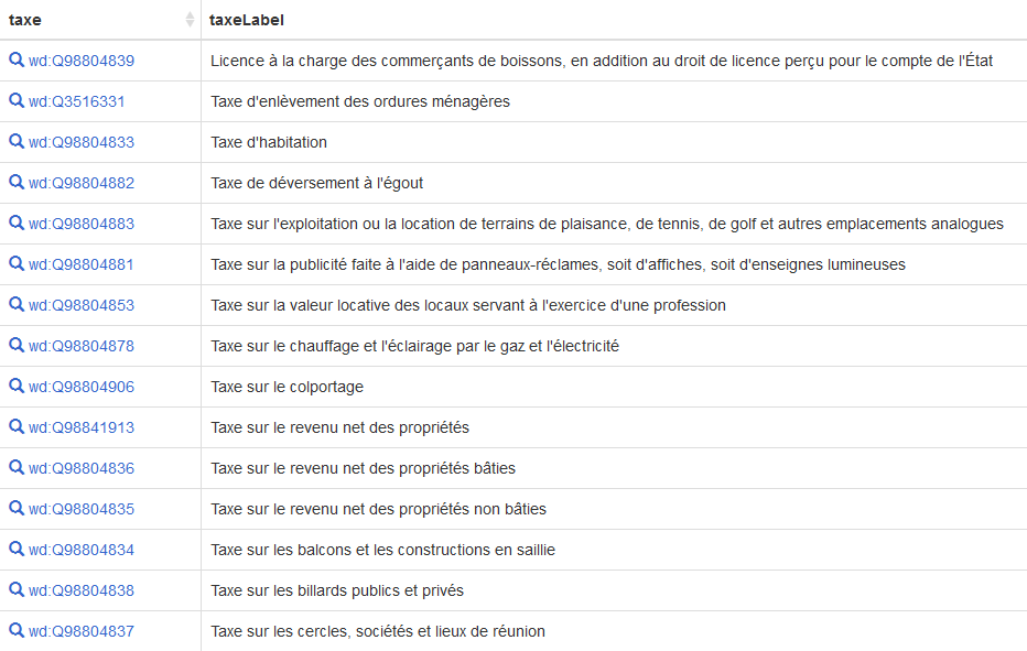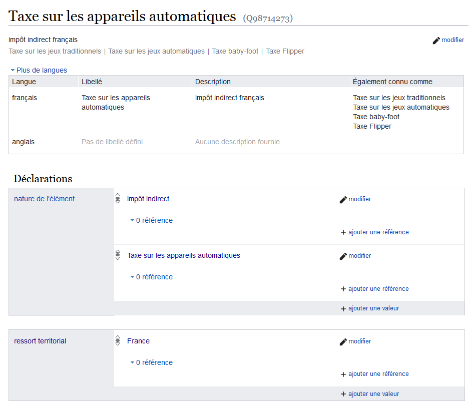 Wikipédia a des articles sur l’imposition française mais bien souvent ces articles décrivent le prélèvement dans plusieurs pays et ne comportent pas beaucoup de données structurées. Et data.gouv.fr est quasiment vide sur ce sujet. Tout ceci explique pourquoi Wikidata n’a rien sur ce sujet. Tout reste à faire.