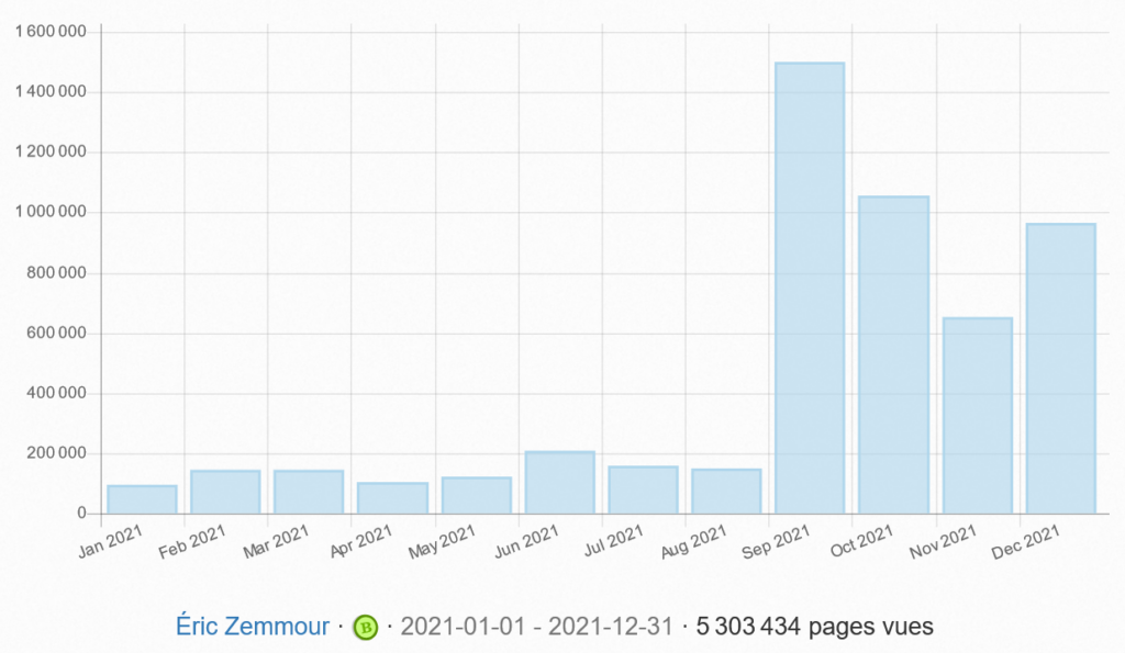 À l’approche de l’élection présidentielle de 2022, la politique devient un sujet très consulté sur Wikipédia. Depuis la rentrée, les médias français parlent énormément d’Éric Zemmour (n°1), cela s’est naturellement traduit par une très forte consultation de sa biographie.