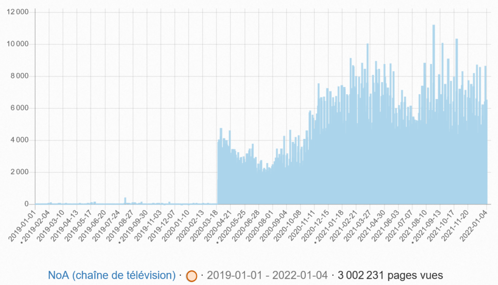 Un bon exemple est l’article France dont une grande partie du trafic de la page est  comptabilisée comme du trafic automatisé. La détection automatique est loin d’être parfaite. Il reste des articles dont le trafic est suspect, notamment France, États-Unis, YouTube, Google, Facebook et la chaîne de télévision NoA (peut être une confusion avec le vidéaste Noa Dorian) que nous préférons écarter du classement. Les courbes d’audience de ces articles généralistes sont marquées par une hausse brutale et prolongé du trafic généralement observées sur le trafic provenant d’ordinateurs de bureau.