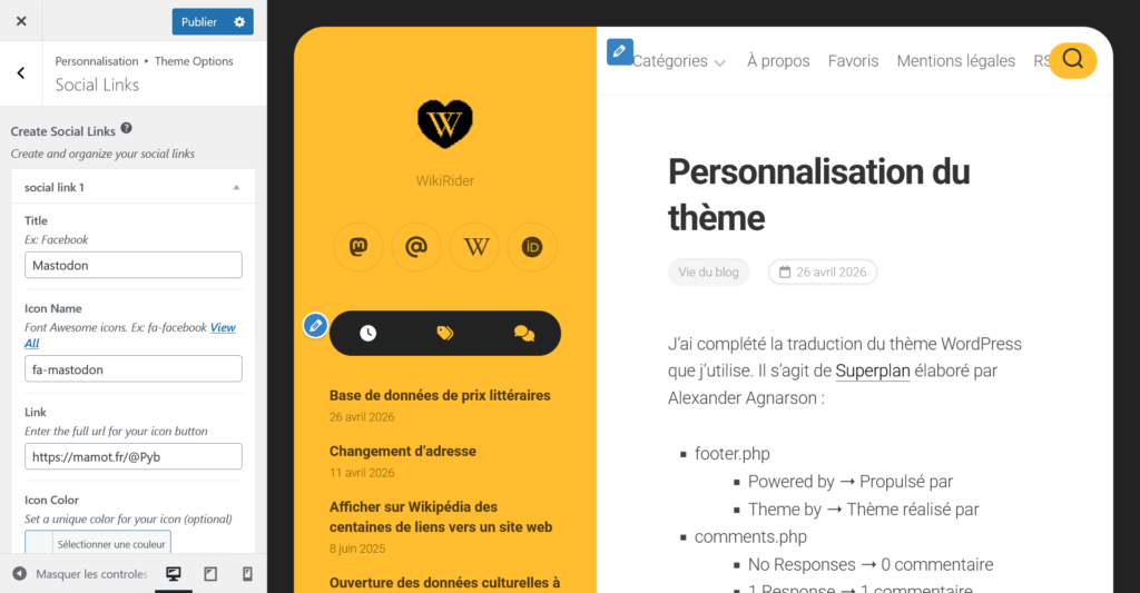 J’ai trouvé comment installer les icônes et j’arrive à les utiliser dans mon instance WordPress, sauf dans cette partie du site gérée par le thème. Je n’ai pas trouvé où le thème sauvegarde l’info lorsque j’indique des réseaux sociaux.
